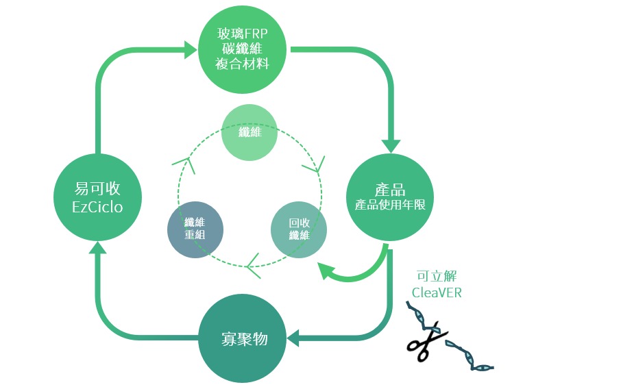 上緯「EzCiclo易可收」是一種可回收再重複利用的環氧樹脂,使用「EzCiclo易可收」做成的玻璃纖維強化塑膠( FRP, fiber-reinforced plastic) 及碳纖維複合材料做成風電葉片,到了使用年限可回收降解,經過「CleaVER可立解」技術將原本要成為廢棄物的「垃圾」,搖身一變成為回收纖維及低聚物,整理後再利用,再次製成玻璃纖維強化塑膠(GFRP)及碳纖維複合材料(CFRP)原料,是一項可重複迴圈之系統。