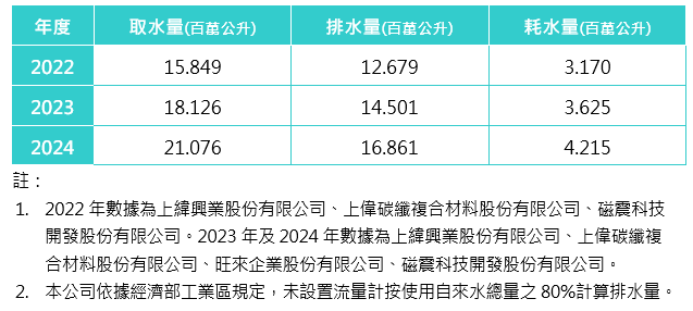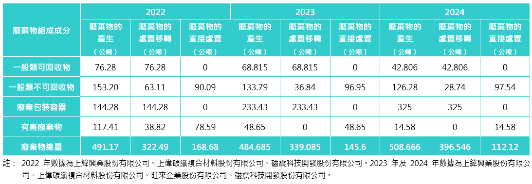 5. 2022 年數(shù)據(jù)為上緯國際投資控股股份有限公司、上緯創(chuàng)新育成股份有限公司、上緯興業(yè)股份有限公司、上偉碳纖複合材料股份有限公司、磁震科技開發(fā)股份有限公司、上緯新材料科技股份有限公司、上緯(江蘇)新材料有限公司、上緯(天津)風(fēng)電材料有限公司、上偉(江蘇)碳纖複合材料有限公司、上緯(馬)有限公司。2023 年數(shù)據(jù)為上緯國際投資控股股份有限公司、上緯創(chuàng)新育成股份有限公司、上緯興業(yè)股份有限公司、上偉碳纖複合材料股份有限公司、旺來企業(yè)股份有限公司、磁震科技開發(fā)股份有限公司、上緯新材料科技股份有限公司、上緯(江蘇)新材料有限公司、上緯(天津)風(fēng)電材料有限公司、上偉(江蘇)碳纖複合材料有限公司、上緯(馬)有限公司。2024 年數(shù)據(jù)為上緯國際投資控股股份有限公司、上緯創(chuàng)新育成股份有限公司、上緯興業(yè)股份有限公司、上偉碳纖複合材料股份有限公司、旺來企業(yè)股份有限公司、磁震科技開發(fā)股份有限公司、上緯新材料科技股份有限公司、上緯(江蘇)新材料有限公司、上緯(天津)風(fēng)電材料有限公司、上偉(江蘇)碳纖複合材料有限公司、上緯(馬)有限公司、上緯再生利用(江蘇)有限公司。