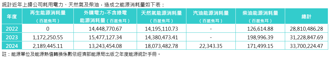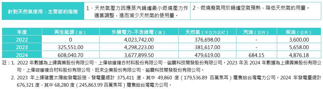 上緯投入生產(chǎn)所需之能源有電力、天然氣、柴油。為改善能源耗用,透過調(diào)整及製程改善,並持續(xù)推動(dòng)相關(guān)能源節(jié)約計(jì)畫。除了減少能源使用之外,上緯亦針對廠內(nèi)規(guī)劃及執(zhí)行節(jié)電計(jì)畫,包含照明、動(dòng)力、電熱、空調(diào)等設(shè)備,進(jìn)行能源效率提升、維護(hù)保養(yǎng)、更換高效率設(shè)備或零件等措施。上緯於2022年開始佈建再生能源,已於上緯興業(yè)股份有限公司設(shè)置444.44KW太陽光電發(fā)電設(shè)備,自2023年開始發(fā)電自用,提昇再生能源佔(zhàn)比、降低外購電力比例。