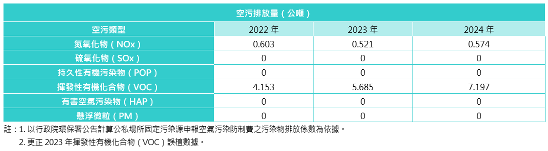上緯廠區(qū)之空氣污染物,主要為揮發(fā)性有機(jī)物(VOC)及氮氧化物(NOx),而所有排放濃度皆低於法規(guī)標(biāo)準(zhǔn)。此外,隨著臺灣環(huán)保法規(guī)日趨加嚴(yán),我們亦積極投入資源進(jìn)行降低污染物排放,選用高效能活性碳吸附處理污染防制設(shè)施,並由環(huán)安人員確保環(huán)保設(shè)施正常穩(wěn)定運(yùn)作,定期保養(yǎng)維護(hù),減少污染排放,降低環(huán)境衝擊。上緯近3年空污排放量如下表,排放量變化主要和製造之產(chǎn)品類別有關(guān)。