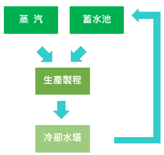 上緯興業(yè)股份有限公司製程為非水溶性製程,自來水多數(shù)使用於鍋爐產(chǎn)生蒸氣,蒸氣投入製程使用熱交換後變成水,再重新導(dǎo)回蓄水池中,設(shè)有 2 座合計(jì) 350 噸蓄水池,蓄水池水提供製程冷卻用途,冷卻排水重新導(dǎo)回蓄水池中,反覆循環(huán)達(dá)到100%製程用水回收再利用。