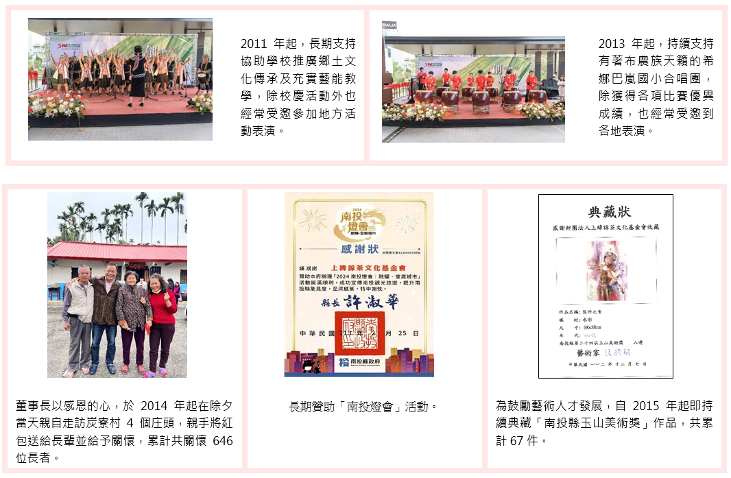 「財團法人上緯諒茶文化基金會」為董事長 蔡朝陽所創辦,以「推動及發揚南投縣各項文化教育及交流活動」為設立宗旨,結合公司以實際行動推展地方藝文活動。 除自行辦理「上緯諒茶獎」書法比賽、炭寮村敬老紅包活動…等文化活動,也配合當地政府辦理南投燈會、「南投縣玉山美術獎」…等活動推廣。