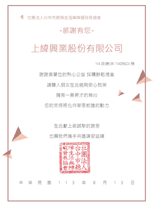 上緯已連續4年以行動支持身心障礙者,與客戶夥伴一起分享中秋公益禮盒,為節日送上溫暖祝福。