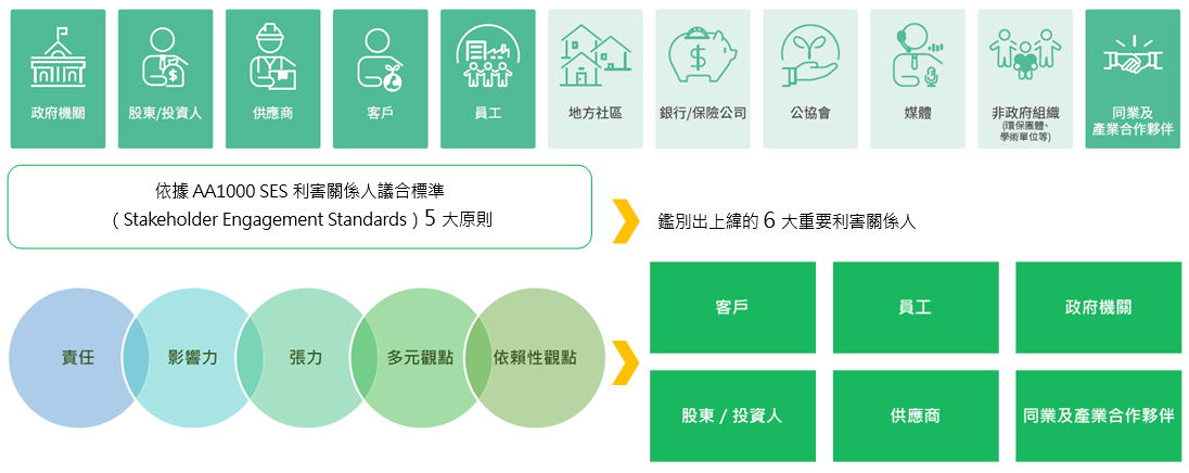 2024年沿用2022年鑑別之結果。2022年上緯共識別出 11類利害關係人清單,包含: