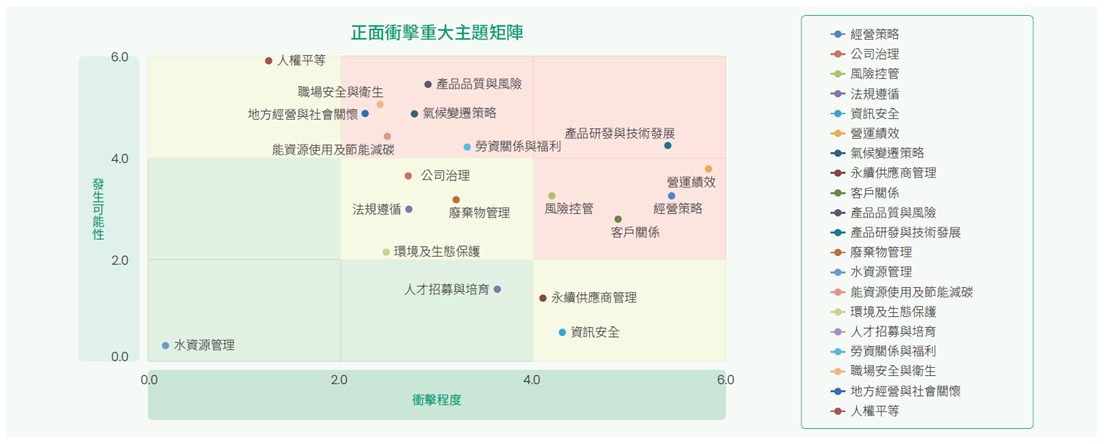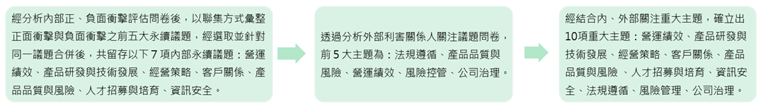 上緯參考GRI 準(zhǔn)則之主題、產(chǎn)業(yè)重要議題以及2024年度之重要發(fā)展後,因2024年相關(guān)產(chǎn)業(yè)及關(guān)注議題與2022~2023年無(wú)太大差異,所以延續(xù)之前分析結(jié)果,篩選出20個(gè)永續(xù)議題。 為了解各類(lèi)重大利害關(guān)係人之意見(jiàn),由各權(quán)責(zé)單位分別對(duì)外發(fā)放關(guān)注議題問(wèn)卷