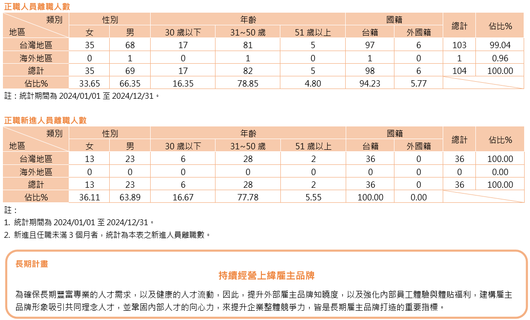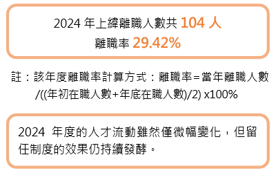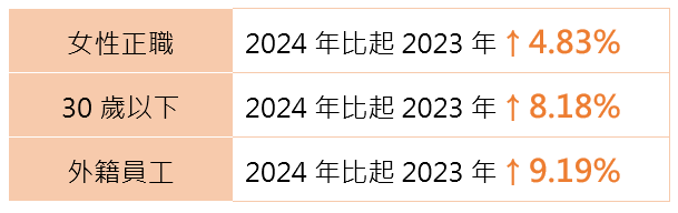 透過網羅多樣性的人才加入,能夠締造更多工作思維創新的轉變,這樣的招募思維更是體現於2024年度新進任職人員的族群占比當中,女性、青年族群以及外籍夥伴任職占比皆微幅成長。