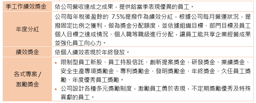 上緯秉持與員工共享利潤的理念來吸引、留任激勵優秀人才,所有的正職員工皆享有一致性的薪酬制度,並透過每年檢視各子公司當地基本薪酬水平,以確保員工薪資在當地具有競爭力,提供員工優於同業且具市場競爭力之薪資水準,且依據集團組織功能,建立各項薪獎暨褔利制度,以提升同仁工作暨團隊士氣,強化集團整體競爭力。除每月薪資及三節禮金之外,亦有各項激勵獎金,2023年開始推動3年3億元的長期激勵獎酬制度,激勵員工積極推廣公司產品,2024年度190人次獲獎,合計獲配股數達65,895,適時激勵士氣並留任優秀員工。