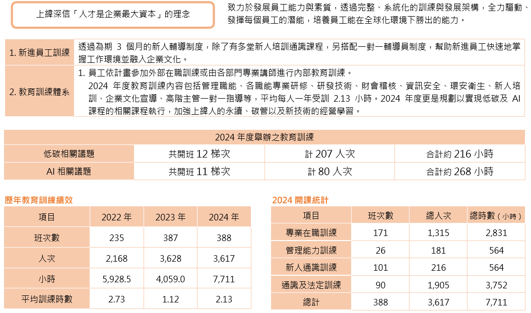 透過新人教育訓練以及平常工作當中,落實公司文化的價值觀,並舉行年度共識營活動,提供公司短、中、長期的公司願景以及發展目標,讓上緯的夥伴們能夠凝聚向心力。