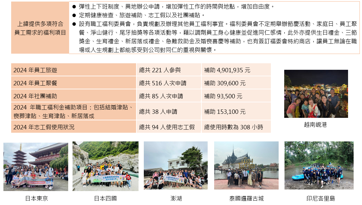 上緯重視提供體貼福利及舒適環境,讓員工更能發揮創意施展長才,2024年更是啟用「上緯集團產業創新園」集團總部大樓,讓工作環境全新升級,自2023年已連續2年榮獲由1111人力銀行評選的「幸福企業」金獎殊榮,透過傾聽員工心聲、硬體設備升級、設立合理且具激勵效果的獎金發放制度以及強調勞逸平衡,積極打造以人為本的企業文化。