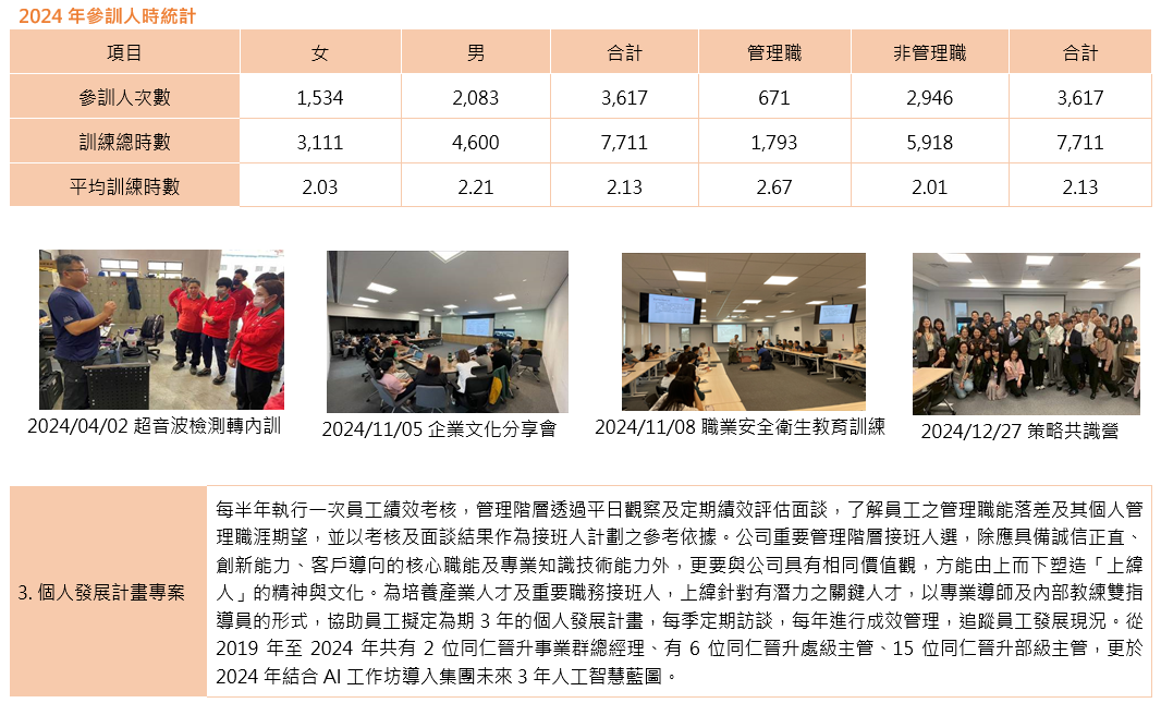 績效考核制度重視公平與平等,全體員工不分性別、職務類別,一律接受公司一年一次之績效考核